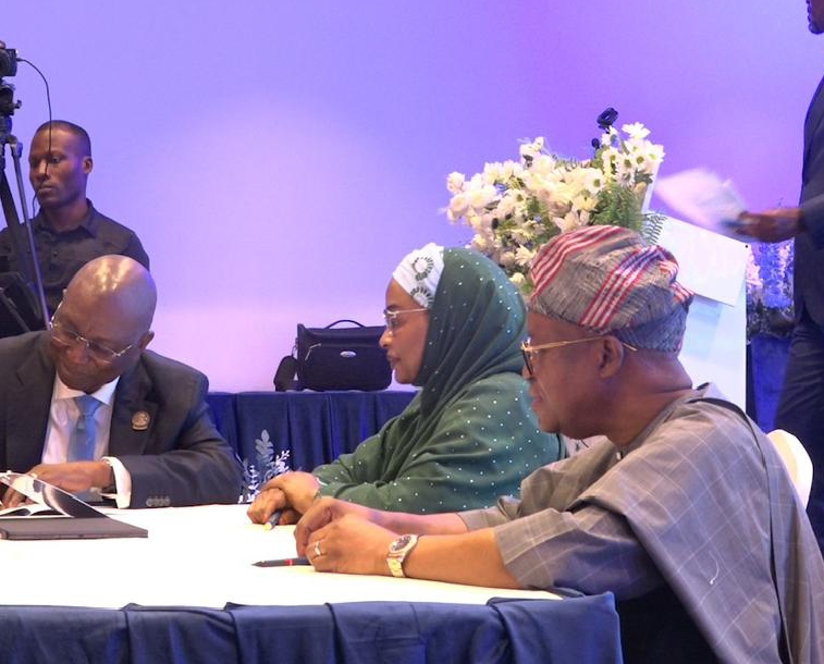 L-R: Director General, Nigerian Maritime Administration and Safety Agency, NIMASA, Dr. Dayo Mobereola, Permanent Secretary Ministry of Marine & Blue Economy Mrs. Fatima Sugra Mahmood and the Honourable Minister, His Excellency, Adegboyega Oyetola, CON during the 2026 Sectoral Performance Retreat and Bond Signing of Agencies under the Ministry in Lagos.