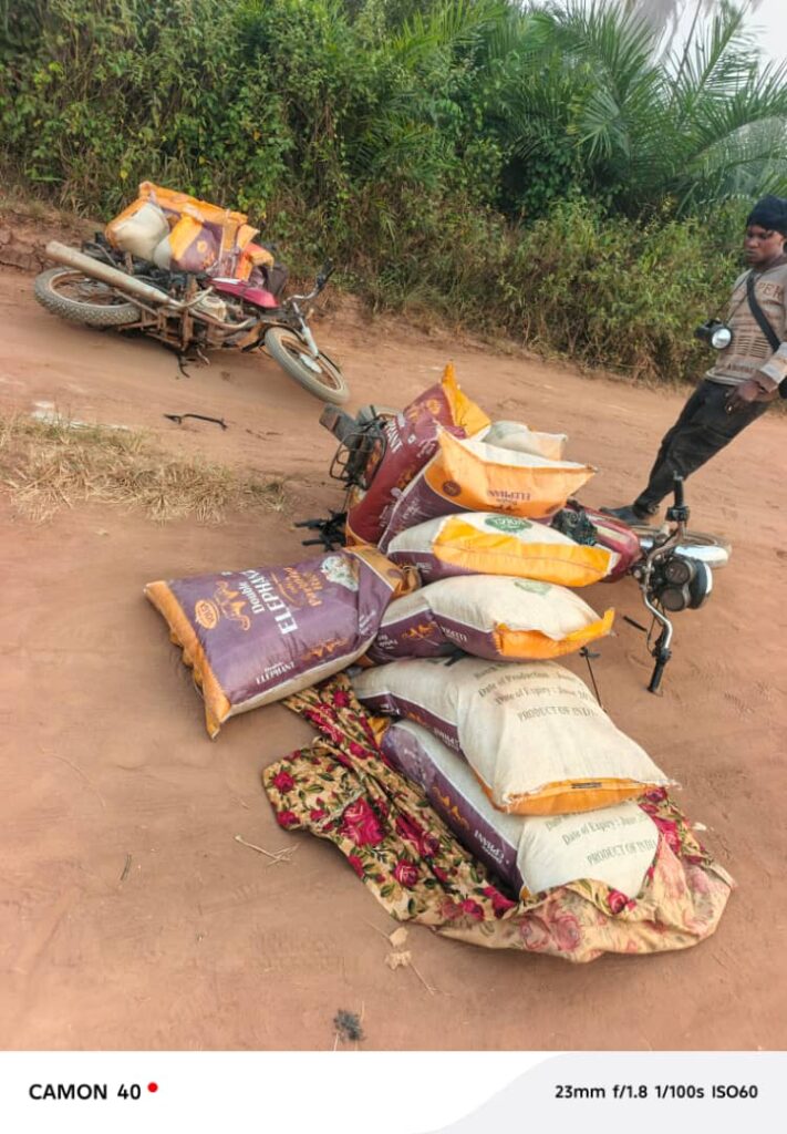 The latest incident, Afeni said occurred at about 0600 hours on Saturday, 31 January 2026, when officers of the Command, on a routine anti-smuggling patrol along a bush path at Alapoti in Ado-Odo/Ota Local Government Area of Ogun State, intercepted a convoy of motorcycles conveying smuggled foreign parboiled rice. According to him, a total of forty-six (46) bags of 50kg foreign parboiled rice were seized and evacuated into an official patrol vehicle as the team exited the location.