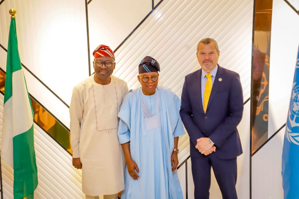 R-L: Secretary General of the International Maritime Organisation, IMO, H.E. Arsenio Dominguez; Honourable Minister of Marine and Blue Economy, Adegboyega Oyetola, CON and the Permanent Secretary, Federal Ministry of Marine and Blue Economy, Olufemi Oluruntola during a working visit by the Secretary General of the IMO in Lagos