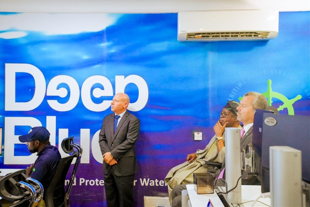 L-R: Secretary-General of the International Maritime Organization (IMO), Arsenio Domínguez and the Minister of Marine and Blue Economy, Adegboyega Oyetola (both on the right) receiving briefing on Nigeria’s Deep Blue project in Lagos, as part of activities marking Domínguez’s visit to Nigeria, on Friday.