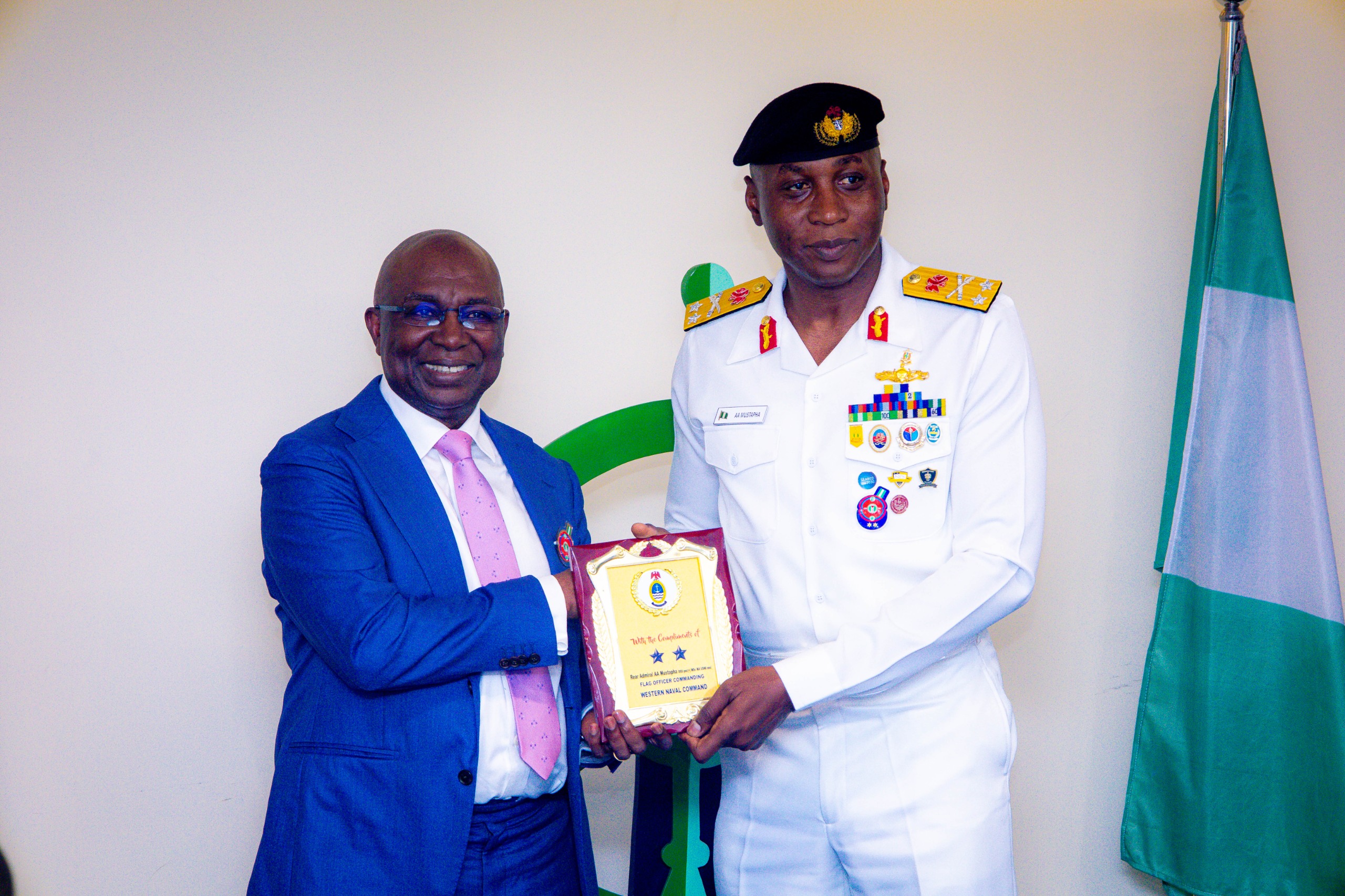 Director General, Nigerian Maritime Administration and Safety Agency, NIMASA, Dr Dayo Mobereola (left) presenting a souvenir to the Flag Officer Commanding, Western Naval Command (FOC-WNC), Rear Admiral Abdullahi Mustapha during a courtesy visit by the FOC to the NIMASA headquarters in Lagos.