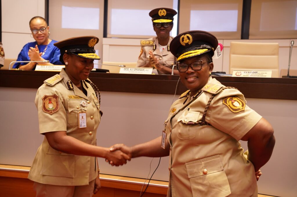 ACG Bewaji in a handshake with the CGI Nandap after her decoration with her new rank